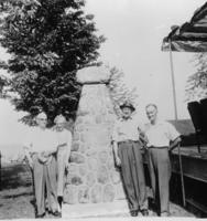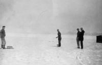 Photo of four men dressed in boots, coats, and hats, standing on the ice of Kempenfeldt Bay (likely near Minets Point),