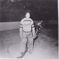 Photo of John "Johnny" Snache on the ice and in full gear wearing a Stroud jersey. Johnny was the goalie for the Stroud, IHS3382-86E