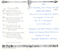 Copy of the funeral card for Bertha May Warnica. The text includes a poem as well as the following information: "Died at