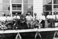 Group photo of the No. 1 Area Innisfil School Trustees, seated on a raised platform in front of the 5th Line School. The, IHS2501