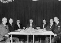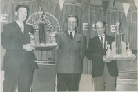 Group of men on stage; men holding trophies, left Mr. Burnett, Gordon Tapp in centre.
