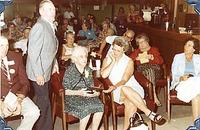 Photo taken during the Cookstown Reunion in 1984 showing Pat Kidd Bertles on stage holding a microphone. Standing in,