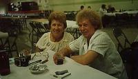 Photo of Daisy Gregg (née Copeland) and Marg Davis at the 1984 Cookstown Reunion. The two ladies are seated at a table,