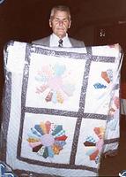 Geoff. Dawney holds quilt won by his daughter Suzanne. This quilt was made and donated by the Anglican Church Women to,