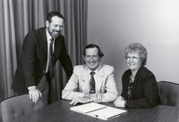 Three people sat at a meeting table in business attire, with a document on the table. (L-R) William (Bill) G Bell, Grant