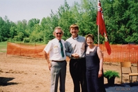 Photograph of three people standing outdoors, in front of an Ontario flag with a construction net behind them, at the