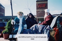 Three individuals sat on a float for the Alcona Santa Claus Parade; it seems that there is a bed featured on the float,