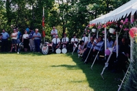 Photograph of Innisfil pipe and drum band sitting in the background, and a tent offering shade on the right side of the