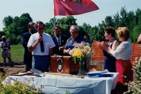 Photograph of Susan Downs receiving what seems to be a cheque from two unidentified men. Downs is central in the photo,