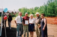 Five people posing with a framed document, suspected to be documentation accompanying the offical ground breaking