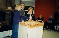 A photograph documenting the reveal of the donor plaque at the offical opening of the Lakeshore Branch of Innisfil