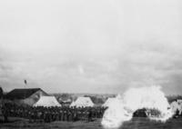 Photograph of troops in uniform amongst several white tents, taken in 1914. Between 1914 and 1918 the Cookstown, IHS1766