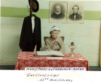 Image of Mary (Mae) Sutherland, age 88. She is sitting at the Institute Exhibit for the 125th Anniversary. There is a