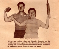 Photo of Bev Cochrane, champion brick thrower, and an unidentified woman, champion rolling pin thrower, from the