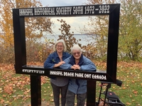 Photo of Donna Wice and Marj Mossman standing inside a specially designed life-sized photo frame installed in Innisfil