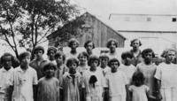 Class photo taken at the Fifth Line School, SS #7. The children are lined up in five rows against a wall, with the girls, IHS1006