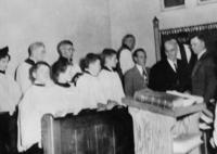Photo depicting the choir of St. Peter's Anglican Church in Churchill. Pictured from left to right in the back row are:, IHS3382-13B