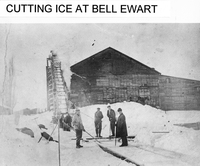 Photograph depicting a number of workers floating ice blocks down a channel towards a conveyor constructed to transport, IHS316
