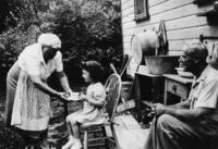 Image taken outside of Bailiwick Cottage, in Belle Air. Pictured left to right are: Nancy Stewart (known as Nan), Nancy, IHS3651