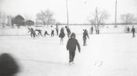 Image taken in 1961 of an outdoor ice skating rink. People can be seen skating in the background of the image, and Anne, IHS4087