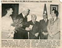 Newspaper clipping from Friday 30 March 1984 announcing the retirement of William Brown, Innisfil Police Chief,