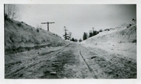 Black and white photo showing the snow lining the sides of an undisclosed Innisfil Township road in the winter of