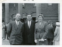 Photo of Harold (left), Ross (centre), and Helen Wallace on 26 May 1955 taken at what appears to be Ross's graduation