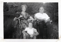Black and white photo of Irene, Rex, and Lynda Lee Guest. Irene and Rex are both seated in folding chairs while Lynda