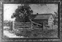 Painting of the log cabin on the northwest corner of Lot 21, Concession 9, in Innisfil Township. where William Samuel