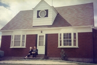 Colour photo of Helen & Harold Wallace taken on Mother's Day. They are standing outside a red brick home. Helen is