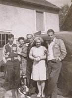 Photo of the family of William S. Young standing in front of a car. Pictured from left to right are Jack, Mary, Bill,