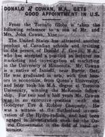 Report (newspaper) of the appointment of Donald Cowan as lecturer at the University of Minnesota., IHS3193