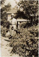 Miss Minnie Spence in her garden at the back of the building. (Next west of the bakeshop),