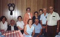 Group photo of the Cookstown Reunion Committee circa 1985. Pictured standing left to right in front of a wood panelled,