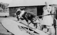 Photo Mrs. H.J. Marquis and her dog pumping water. As the dog walks on the wheel, the wheel turns and powers a water, IHS3382-63