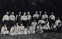 Outdoor photo of members of the Irving and Luck family. Standing on the far left in a hat, coat, and waistcoat is George, IHS2378-C