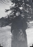 Photo of Eleanor Elizabeth Zeta Barclay, known as Zeta, outside of the Barclay home. She is wearing a long wool coat and