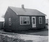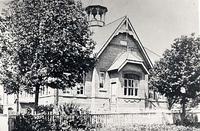 Photo of Cookstown Public School's exterior. The front of the building is bordered by a picket fence and two trees, and,