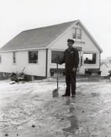 Photo of Albert Edward Cheesman clearing snow from the front of the Meadowbrook main building. Located on south half of