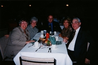 A group of five Credit Union coworkers sat at a restaurant table, celebrating Christmas. (L-R) Carol Benoit, Donna Wice,