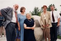 Five people standing infront of a commemorative stone and plaque for Kenneth Earl Kidd. Among the people photographed