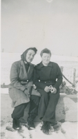 Two women sitting, wintery scene
