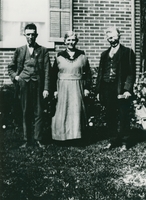 Portrait of three people: Elward Spindloe, Mary Trumbley, and Tom Trumbley, standing outside of a brick house.