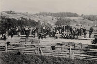 Photo of a large number of men standing on the site of a barn raising, posing for the photograph. The raising of a barn, IHS83