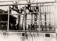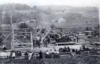Image taken of a barn raising. In the image a group of men can be seen assembling the formational beams on top of the, IHS881