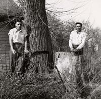 Image of Allan and Douglas in the process of cutting down a large tree. They stand either side of the tree. Once cut, it