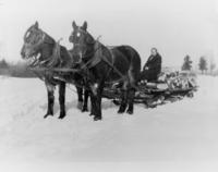 Image taken in 1922 of Howard Allan in a sleigh with his children Ronald and Grace. The sleigh is being pulled by a, IHS1308