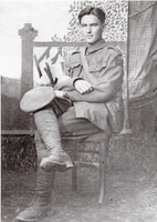 Photo of a young man identified as Harry Webb wearing a first World War uniform. He is seated on a wooden chair, one leg