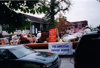A 1997 Agricultural Society parade float traveling through Queen Street in Cookstown. The float is being pulled by a