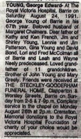 Newspaper obituary announcement for the death of George Edward Young obituary at the Royal Victoria Hospital on 24